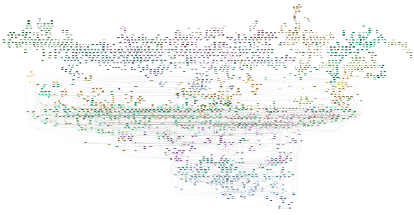 在最宏观的视角下,Math Academy 的整体课程体系由数千个相互关联的知识主题构成,内容横跨从小学四年级至大学阶段的数学知识。所有这些主题都在知识图谱中紧密相连。从这个角度看,一门课程实质上就是我们知识图谱中的一个特定区域。(在下方的可视化示意图中,不同的颜色代表不同的课程。)