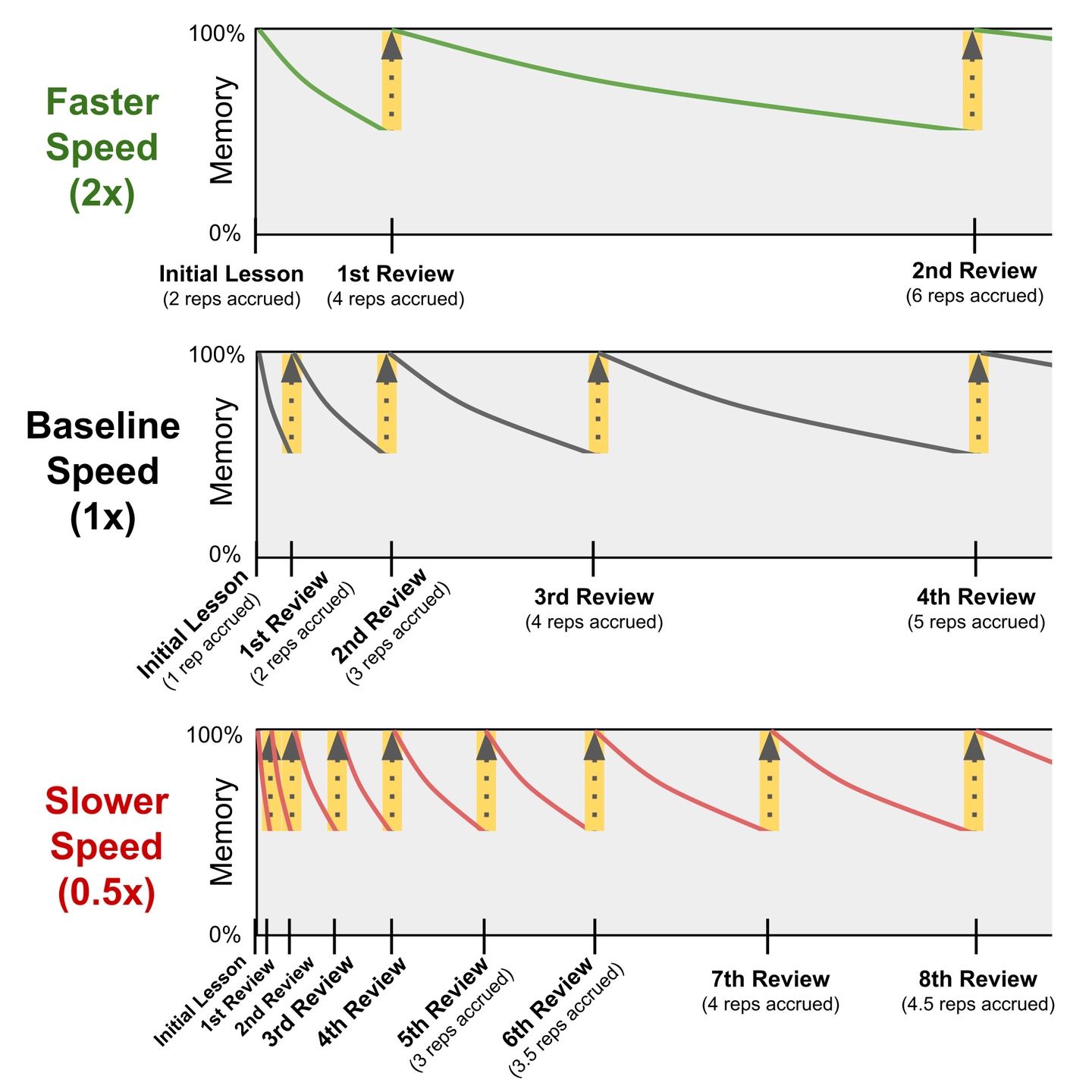 - 反之,0.5x 的速度则意味着该主题对学生而言更具挑战性,学生将以标准值一半的速度推进其间隔重复进程,因为他们在这个特定主题上需要更为频繁的练习。