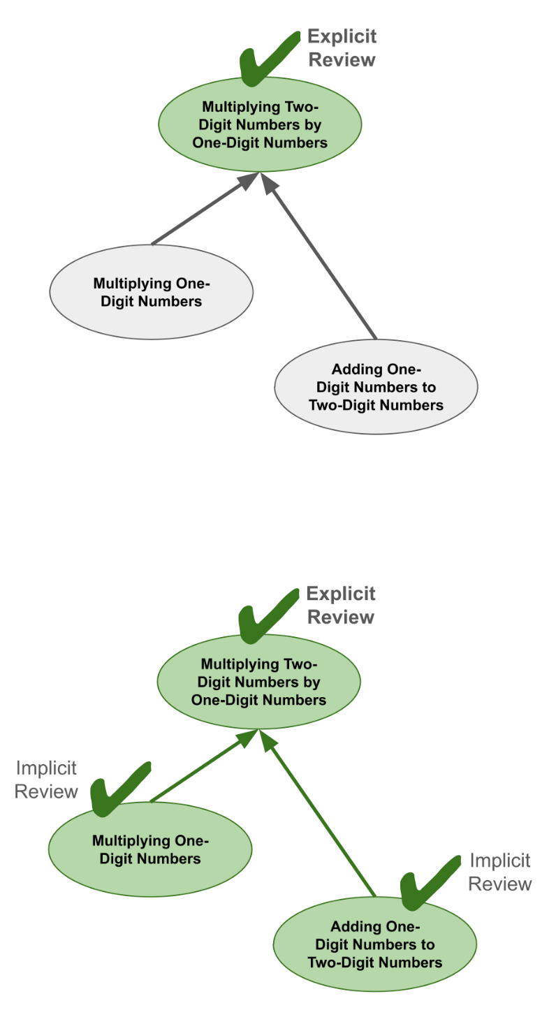 例如,如果一名学生同时有 一位数乘法、一位数与两位数加法 以及 两位数乘以一位数 这几个主题需要复习,那么他们仅需进行一次关于 两位数乘以一位数 的复习,便可一并完成所有这些复习任务。这是因为这次复习的效果会「涓滴」到另外两个被隐式练习到的主题。