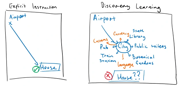 虽然这样的实验常被用来贬低发现式学习(discovery learning),但它们从未真正评估「整体学习」的成效。它们只关注了那些人为挑选的具体目标,而且都必须在短时间内达成。如果这个目标是实实在在的任务——比如送快递,那么完成它确实有意义。但若不是,那就必须认真比较一下:为了完成一个狭隘的目标,我们牺牲了多少原本可以不期而遇的学习?