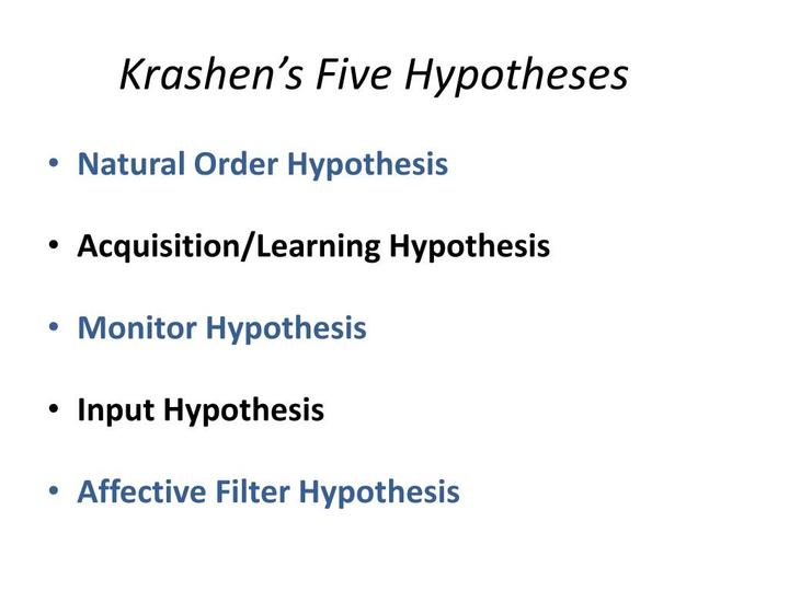 下述所有假说中,习得与学得的区别最为基本。它指出,成年人提高第二语言能力,有两种泾渭分明且各自独立的方式。