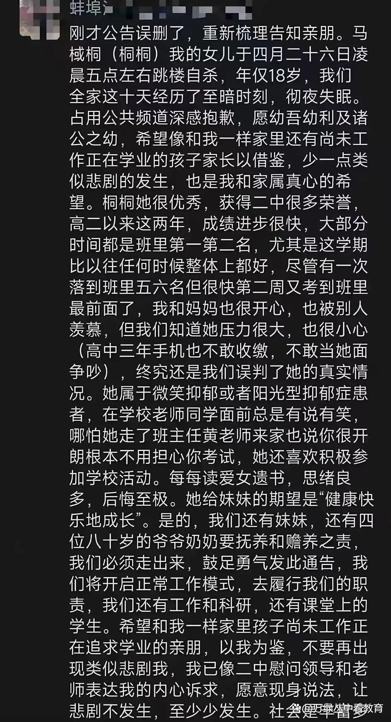读了这篇遗书之后,感觉他们学校挺好的,老师关爱学生,同学也很友善;家长的教育方式确实有点问题,但也没比大多数中国家长差到哪去(父母连和别的家长讨论成绩都要偷偷删聊天记录,怕给孩子压力。有人说她爹妈是无耻小人岳不群,但我觉得吧,大多数中国家长已经可以纳入任我行或者东方不败的范畴了……)。