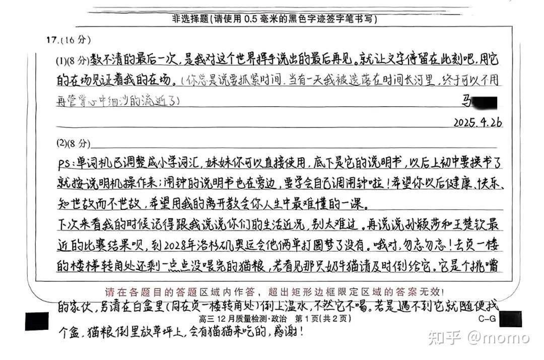 下次来看我的时候记得跟我说说你们的生活近况,别太难过。再说说孙颖莎和王楚钦最近的比赛结果呗,到2028年洛杉矶奥运会他俩单打圆梦了没有。哦对,勿忘勿忘!去负一楼的楼梯转用处还剩一点点没喂完的猫粮,若看见那只奶牛猫请及时倒给它。它是个挑食的家伙,另请在白盒里(同在负一楼转角处)倒上温水,不然它不喝。若是遇不到它就随便找个盒,猫粮倒里放草坪上,会有猫猫来吃的,感谢!