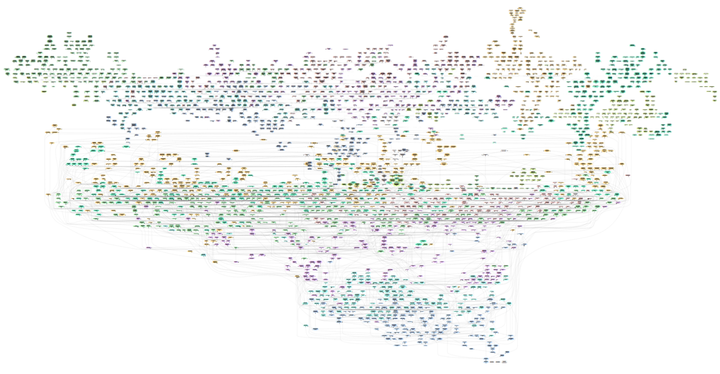 在最宏观的视角下,Math Academy 的整体课程体系由数千个相互关联的知识主题构成,内容横跨从小学四年级至大学阶段的数学知识。所有这些主题都在知识图谱中紧密相连。从这个角度看,一门课程实质上就是我们知识图谱中的一个特定区域。(在下方的可视化示意图中,不同的颜色代表不同的课程。)