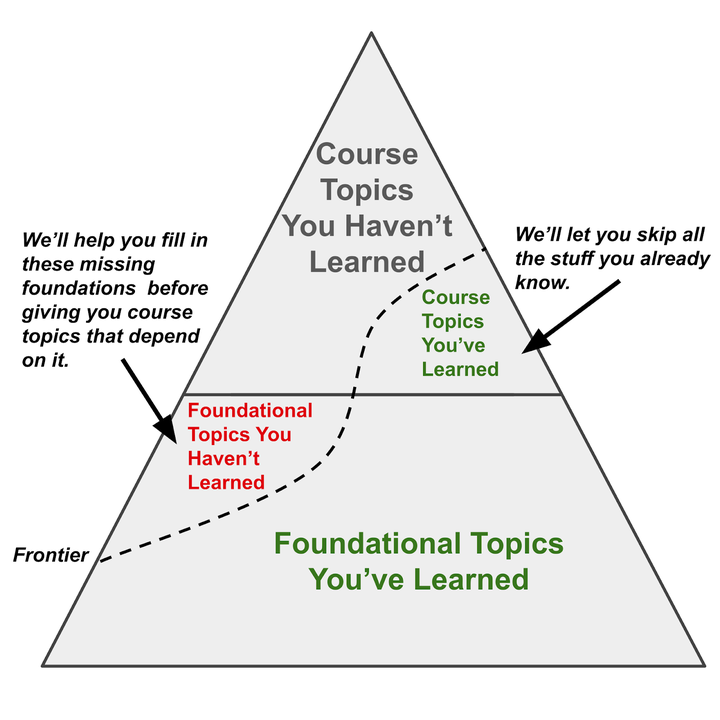 我们的诊断服务专为特定课程量身打造——但在评估课程内容掌握情况的同时,也会评估学生为顺利完成该课程所必须具备的早期阶段基础知识。新加入的学生往往缺乏某些基础知识。这种情况在传统课堂中或许会导致学习困难,但我们的诊断系统即便在学生的知识边界低于其当前课程水平时,也能够准确评估出来。诊断结束后,我们会帮助学生弥补所有缺失的基础知识,同时允许他们学习那些不依赖于这些缺失基础的课程主题。