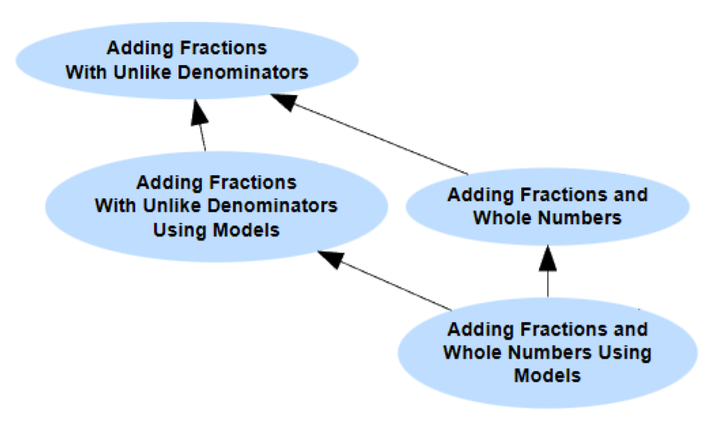 举例来说,下方这个小型的知识图谱展示了主题 异分母分数加法(顶层)拥有两个前置知识:1) 运用模型进行异分母分数加法,以及 2) 分数与整数加法(中层);而这两个前置知识各自又拥有一个共同的前置知识,即 运用模型进行分数与整数加法(底层)。