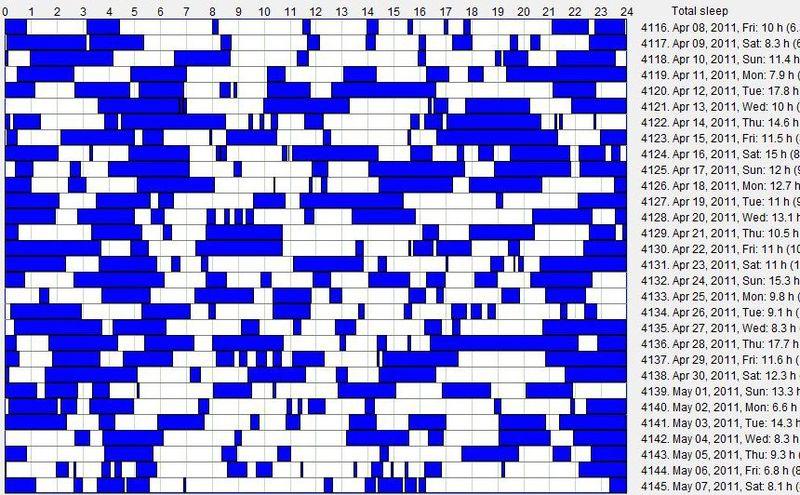 一个示范性的SleepChart记录,显示了婴儿出生第一个月的睡眠情况。所有睡眠时段的总和显示在右侧,平均每天略高于 10 小时,且每天有较大的波动,反映了诸如散步、家庭探访、尿布皮疹发作、奶粉补充等稳态因素变化的影响。