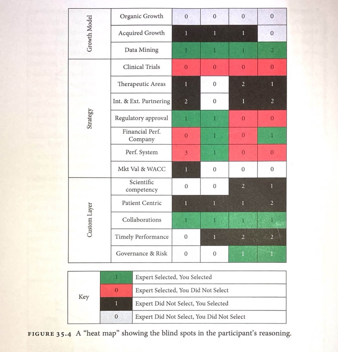 每一条线索都好比是犯罪现场的DNA或指纹。专家不仅能洞察其重要性,更能理解其深层含义。因此,如果参与者能够预测案例中的高管未能预见到市场即将出现的衰退,并能准确找出那些实际上预示着这场衰退的早期警示信号,那么我们就能判定,他们关注到了我们模型中关于市场部分的正确线索。每一个问题和每一条线索都会通过一个关联矩阵进行编码,这个矩阵与我们的专家模型相对应。基于此,我们可以生成图表,将参与者的心智模型与理想专家的模型进行对比,并生成一张热力图,用不同颜色标示出参与者成功识别的关键线索,以及他们所忽略的线索盲点(以黑色标示)。
