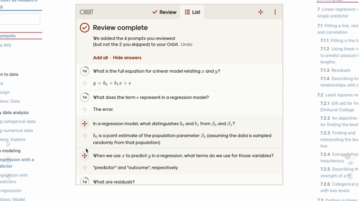 - 因此,我会专注于阅读并努力理解材料。几分钟后,我会发现作者嵌入了一个复习框,我可以在其中快速测试自己对文本关键细节的掌握,并将这些材料融入我的 Orbit,以便我随着时间的推移更深入地吸收它们。到目前为止,一切都很熟悉。