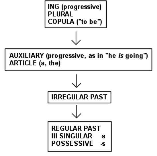 就「自然顺序假说」而言,英语或许是受到最广泛研究的语言;而在所有的英语结构中,形态学又是研究得最为透彻的部分。Brown (1973) 的报告指出,以英语为母语的儿童在习得语言时,倾向于先掌握某些语法语素或称功能词,之后再掌握另一些。例如,进行时标记 -ing (如「He is playing baseball」(他正在打棒球)。)和复数标记 /s/(如「two dogs」(两条狗))属于最先习得的一批语素;而第三人称单数标记 /s/(如「He lives in New York」(他住在纽约))和所有格标记 /s/(如「John's hat」(约翰的帽子))通常要晚得多才习得,大约会延迟六个月到一年之久。de Villiers and de Villiers (1973) 通过横向研究的方法,证实了 Brown 的纵向研究结果,他们发现 Brown 认为最早习得的语言项目,也正是儿童们在实际运用中倾向于更频繁正确使用的项目。换言之,就所研究的那些语素而言,其掌握的难度顺序与习得的先后顺序是相似的。