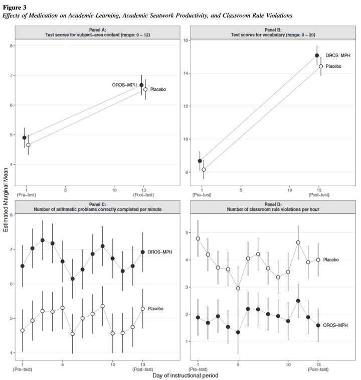 研究对象是 173 名 7 至 12 岁的儿童,以西班牙裔男孩为主。他们参加了一个专门帮助 ADHD 儿童提高注意力和专注能力的「治疗性夏令营」(温馨提示:可不敢说成「集中营」*哈)。每天,孩子们会上两节简短的课:一节词汇课,另一节则涵盖各种不同主题。研究分为两个阶段,每阶段三周。第一阶段,随机选取一半的孩子服用专注达(一种长效利他林),另一半不服用;第二阶段,两组交换用药情况。此外,每天还安排了 10 分钟的快速数学测试作为额外评估。以下是研究结果: