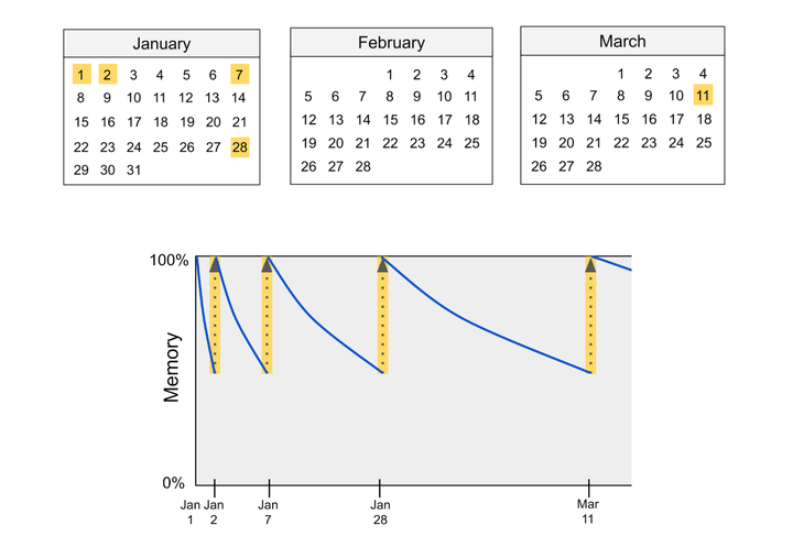 下面是一个例子,用来说明间隔重复的过程和威力。假设你学习了一个新单词。起初,你可能只能记住这个单词一天。但如果你在第二天测试自己对其含义的记忆,那么你可能会记住它直到周末。如果你在周末再次进行自测,那么你可能会记住几周。如果你坚持这种间隔重复的计划,最终你将能够在两次重复之间间隔多年(Bahrick et al., 1993)。