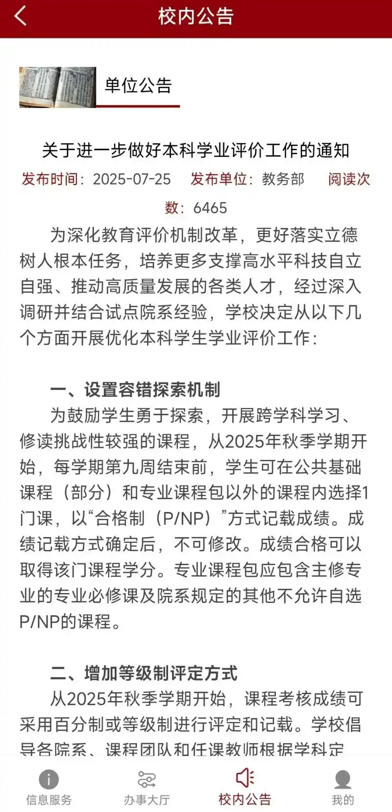 通知中提到,为鼓励学生勇于探索,开展跨学科学习、修读挑战性较强的课程,自2025年秋季学期开始,每学期第九周结束前,学生可在公共基础课程(部分)和专业课程包以外的课程内选择1门课,以“合格制(P/NP)”方式记载成绩。成绩合格可以取得该门课程学分。