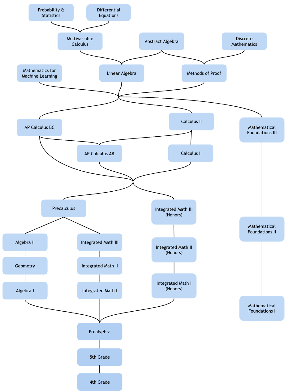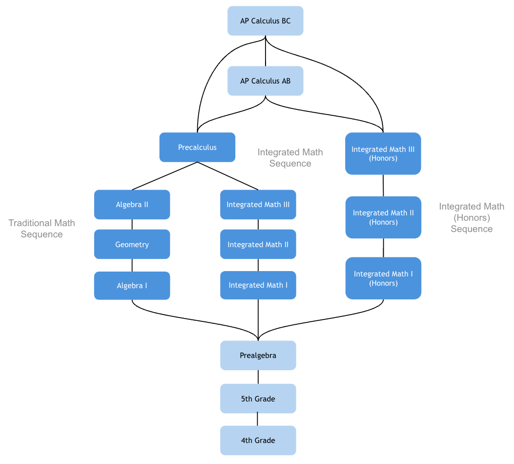 荣誉序列课程在三年内学完四年的高中数学内容(包含预微积分)。相比之下,标准的综合数学序列的终点与代数 II 水平相当,之后衔接预微积分。