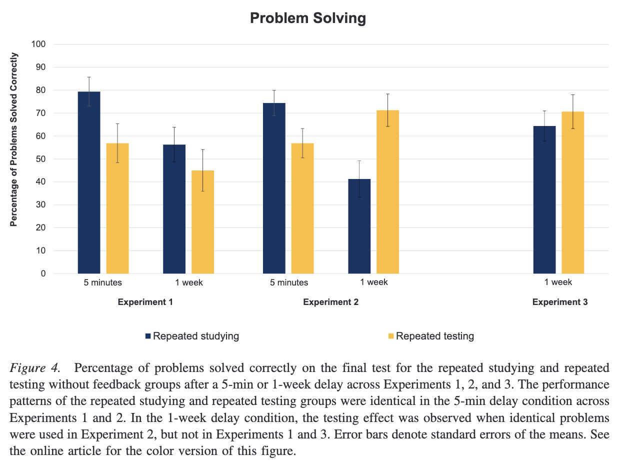 - 但测试的优势仅体现在解决相同题型的问题上;当把同样的问题「结构」以多种不同形式呈现时,测试的优势便消失了——即便实验明确告知学习者,要用先前示例中相同的步骤来解题,结果也是如此。