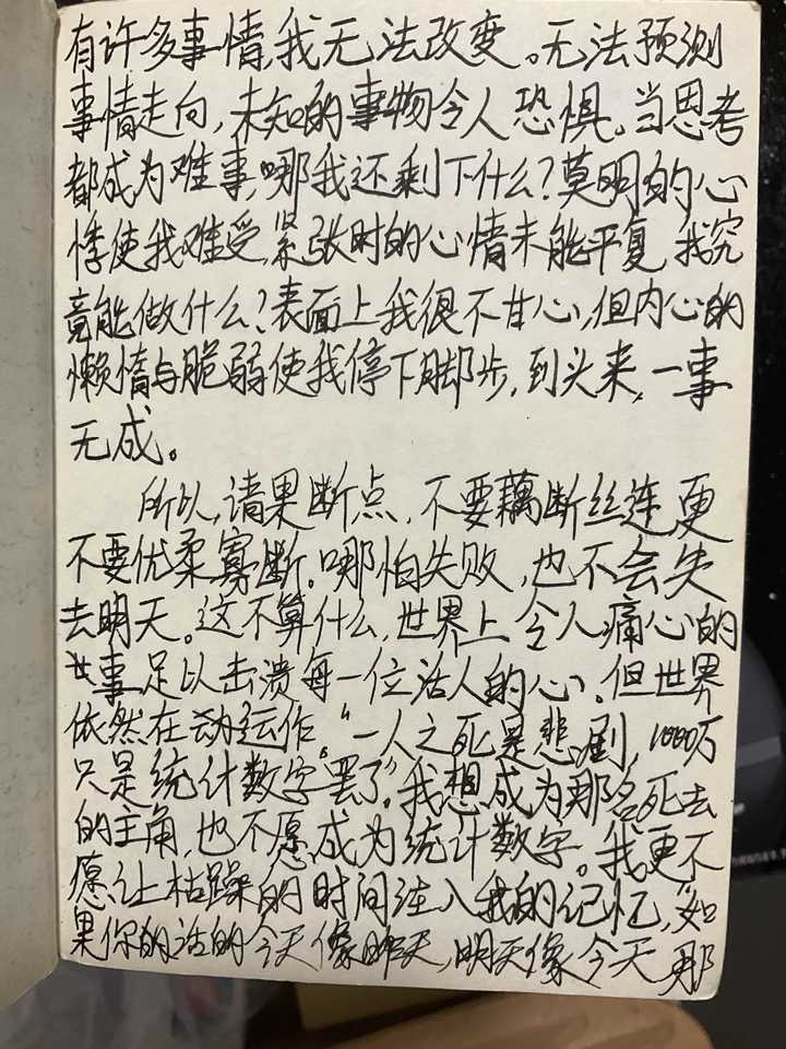 有许多事情我无法改变。无法预测事情走向,未知的事物令人恐惧。当思考都成为难事,那我还剩下什么?莫明的心悸使我难受,紧张时的心情未能平复。我究竟能做什么?表面上我很不甘心,但内心的懒惰与脆弱使我停下脚步,到头来一事无成。
