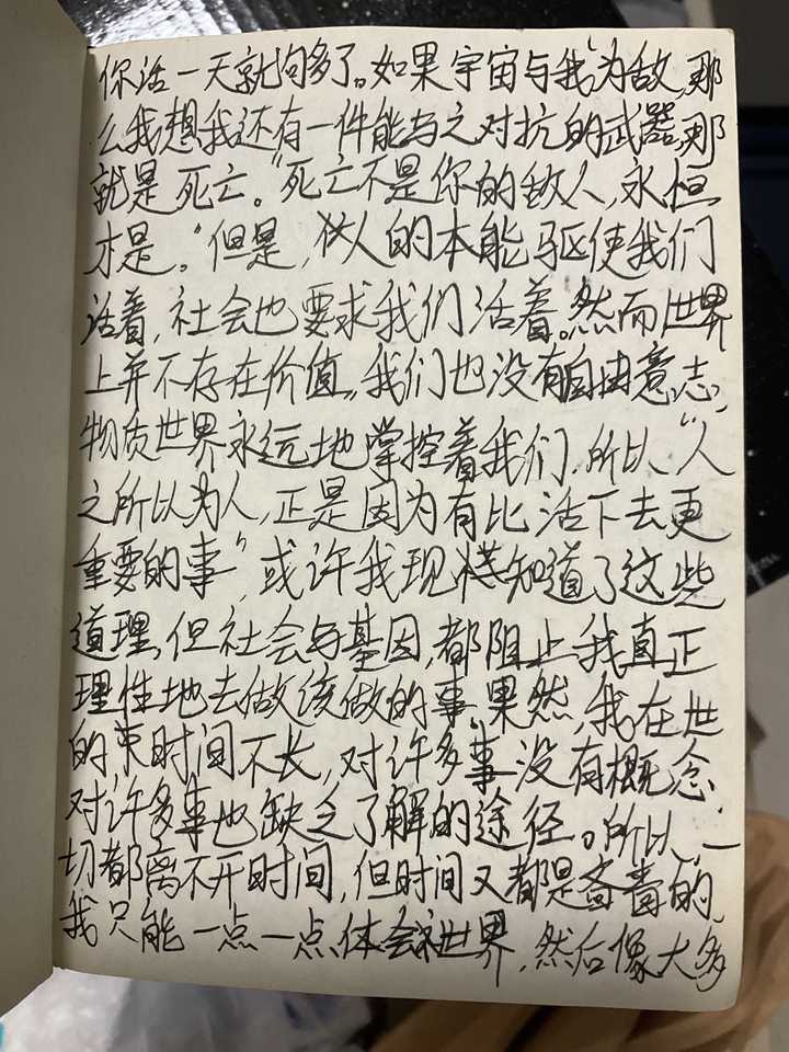 如果宇宙与我为敌,那么我想我还有一件能与之对抗的武器,那就是死亡。“死不是你的敌人,永恒才是。”但是,人的本能驱使我们活着,社会也要求我们活着,然而世界并不存在价值,我们也没有自由意志,物质世界永远地掌控着我们。所以,人之所以为人,正是因为有比活下去更重要的事。或许我现在知道了这些道理,但社会与基因都阻止我真正理性地去做该做的事。果然,我在世的时间不长,对许多事没有概念,对许多事缺乏了解的途径。所以一切都离不开时间,但时间又都是吝啬的。我只能一点一点体会世界,然后像大多数人那样,普普通通的死去。