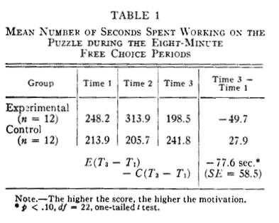 当所有参与者随后进入「自由选择」阶段,研究人员测量了他们花在拼图上的时间,发现实验组——即那些获得了 1 美元奖励的人——实际上玩拼图的时间反而更少了。