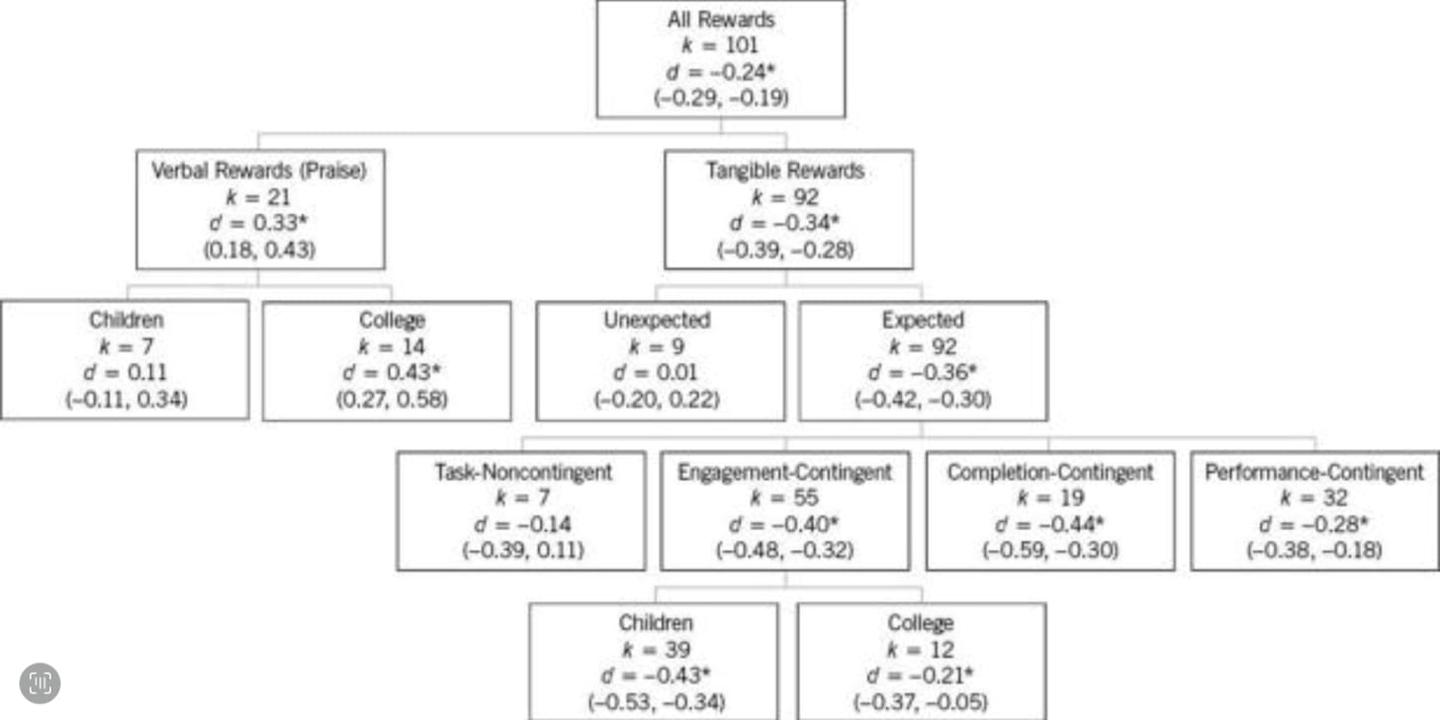 多年来,已有海量的实验研究了不同奖励及其附加条件对内在动机的影响。1999 年,Deci 等人对所有这些研究进行了一项大规模的元分析。以下是其主要结果: