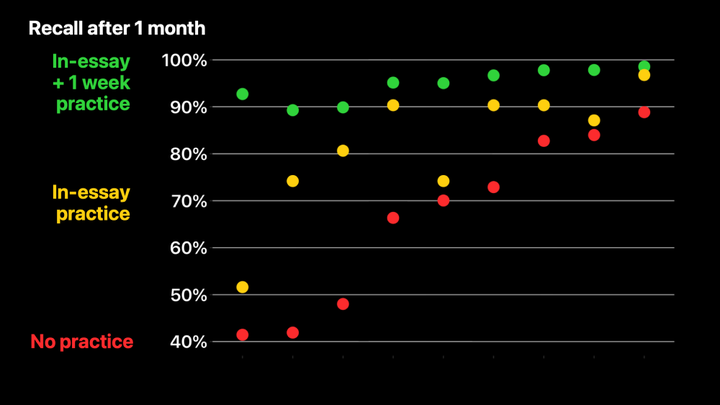 另一组用户在阅读文章时进行了练习,就像我们刚才在视频中看到的那样。对于他们忘记的问题,第二天还有一次额外的练习。然后这些问题消失了一个月,再进行测试。这些读者表现明显更好,尽管仍有一部分人答错了一些问题。