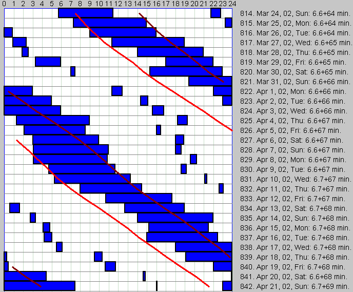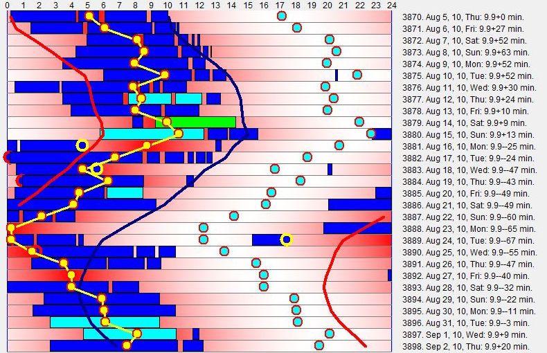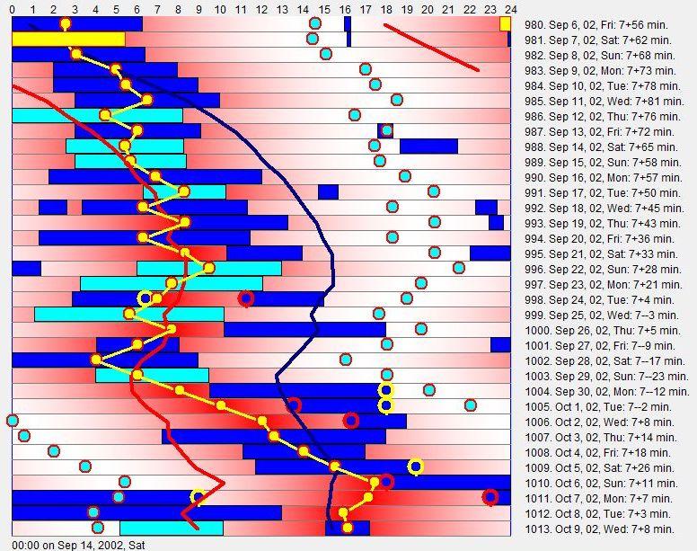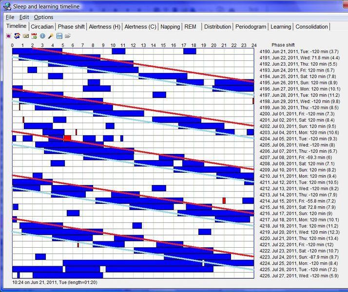 当我们检查受试者 S 最近几个月自然睡眠的 SleepChart 时,会发现其每天的睡眠相位偏移仅大约 41 分钟(而不是稳定维持 28 小时工作日制所需的 240 分钟):