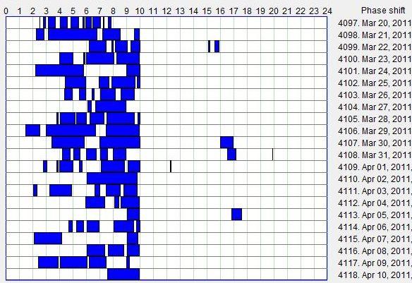 在上图中,可以注意到一个潜在的自由驱动的生理节律周期模式,其主观夜晚大约在 2011 年 4 月 6 日脱离了常规的夜间时段。将睡眠片段整合后,这一趋势更为明显: