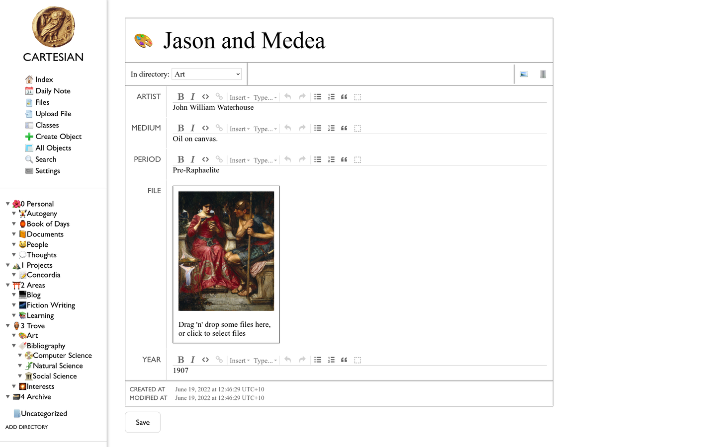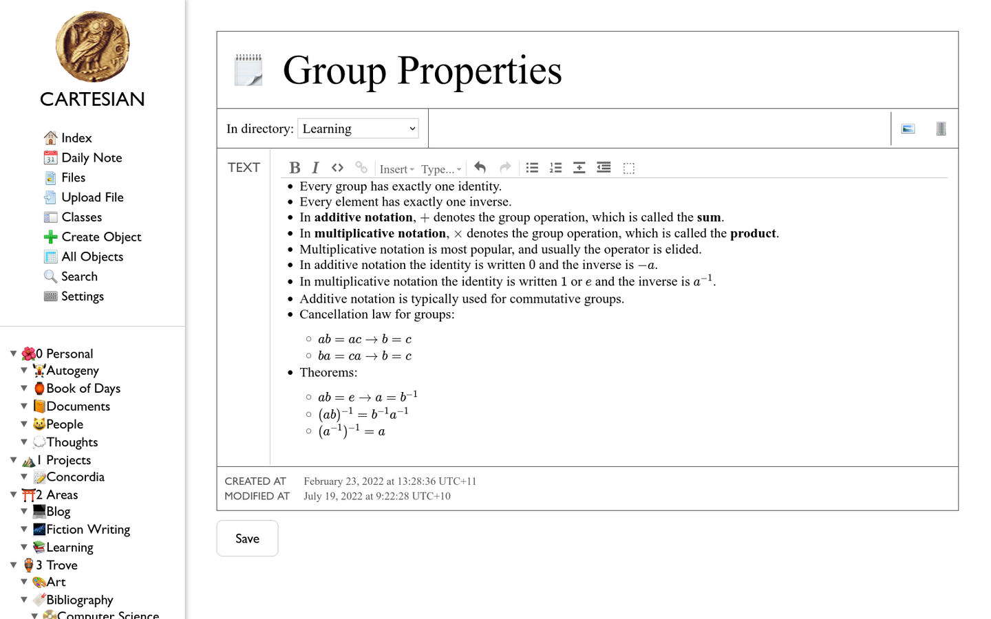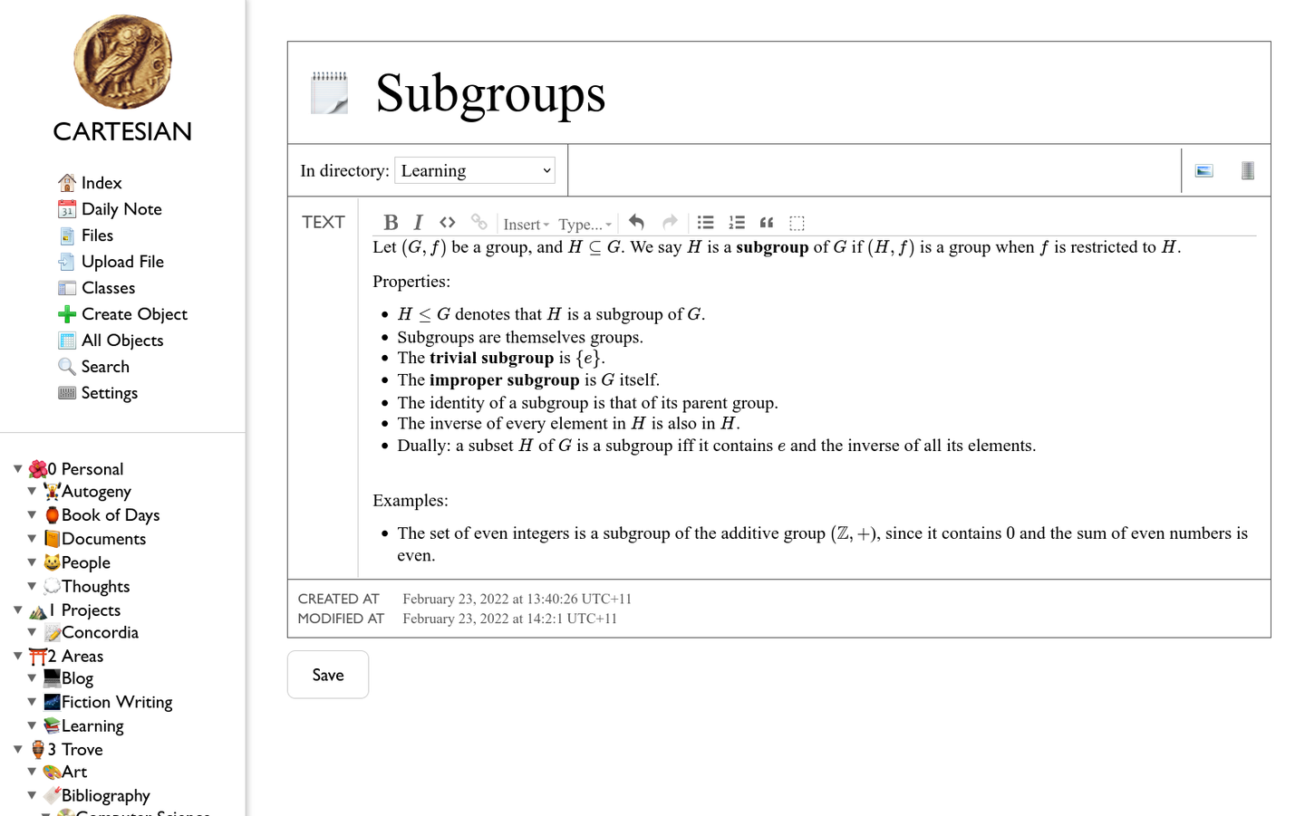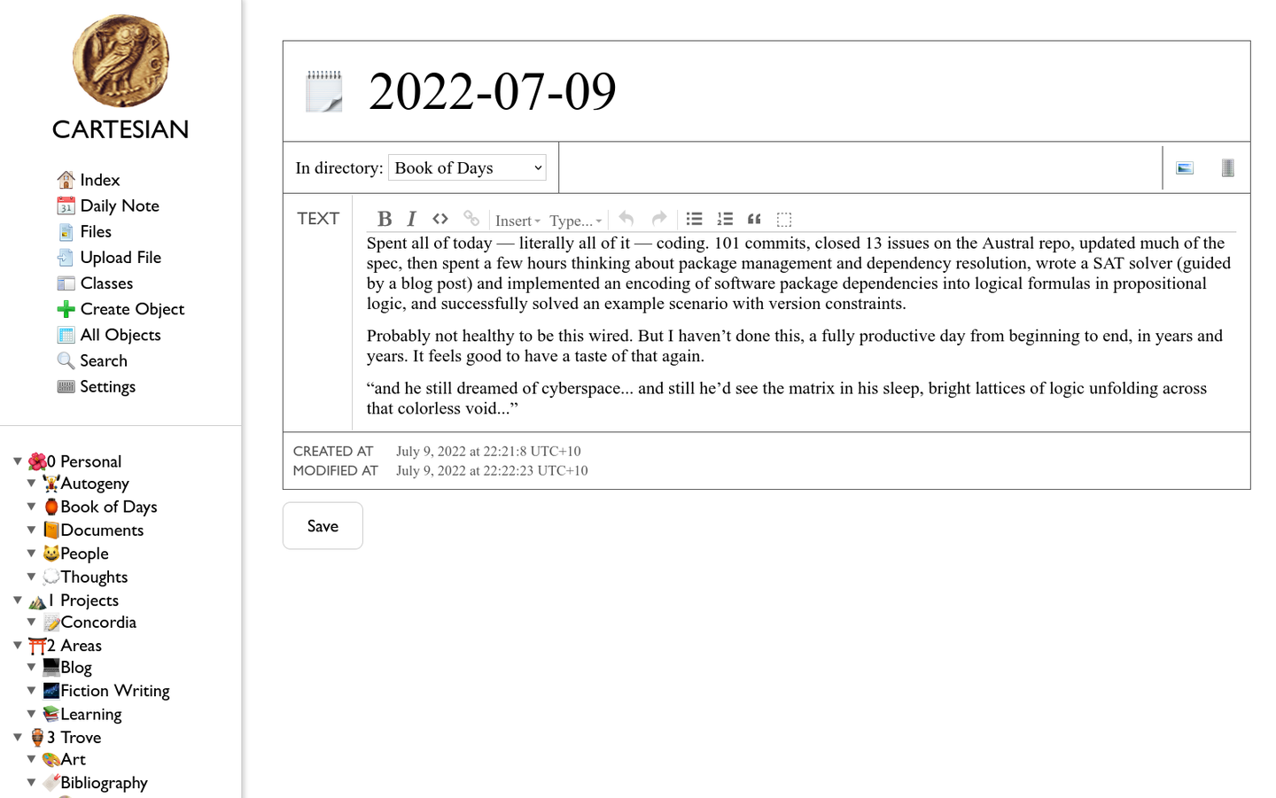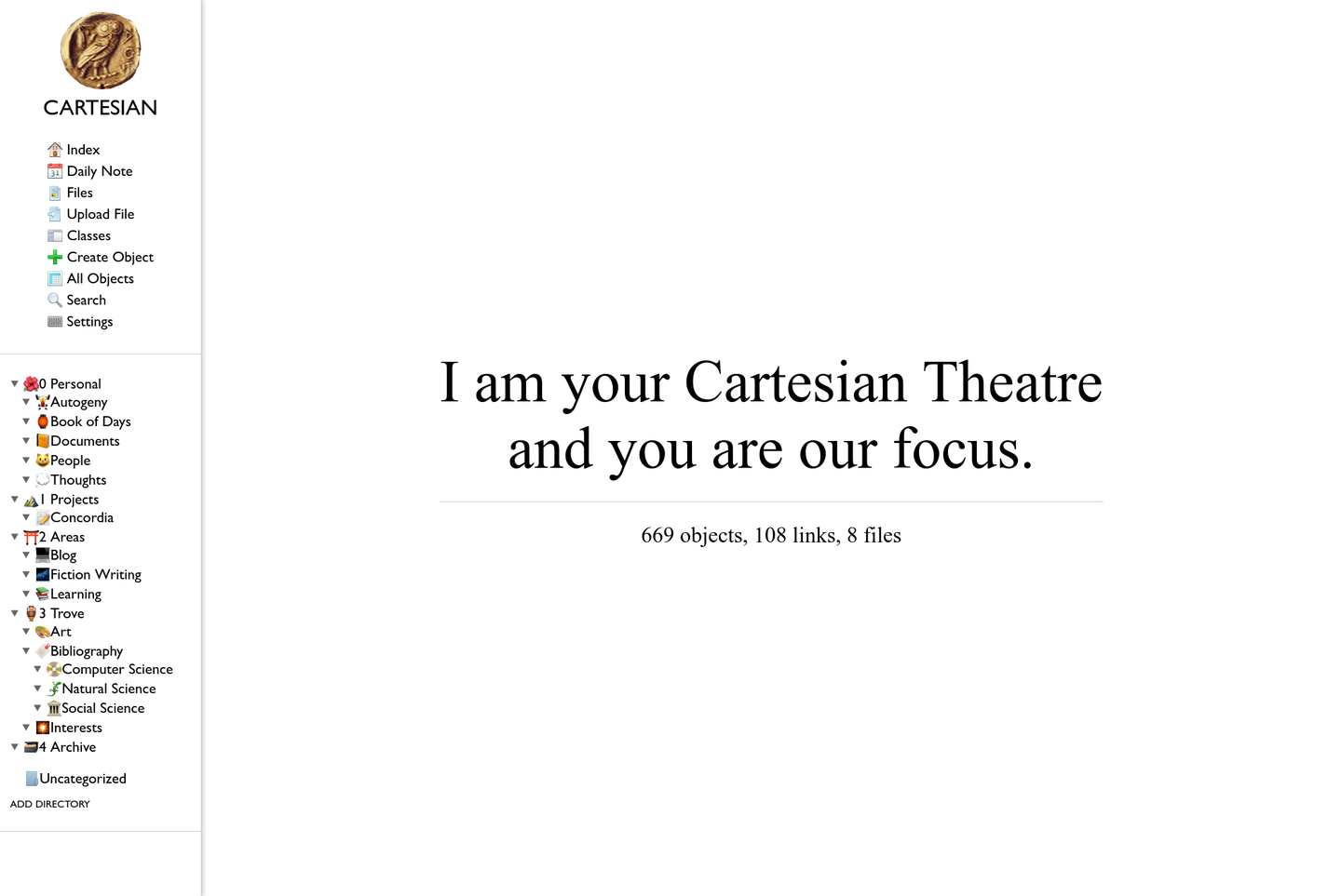 我目前的个人维基叫 Cartesian(名字来源于笛卡尔剧场,因为我最初的设想要宏大得多)。其核心概念很简单:对象、类和链接。