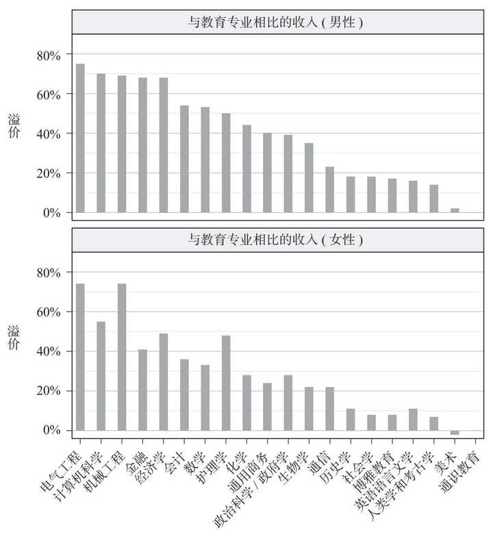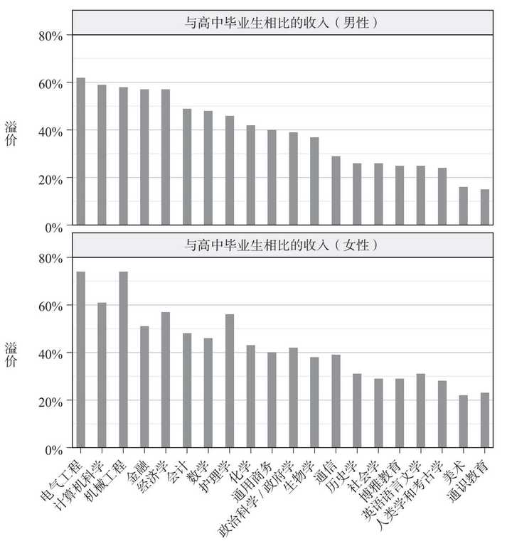 注:修正最高学历指标后所选专业毕业生的收入情况。观测对象同时具备以下条件:学士及以上学位,每周工作时间大于 34 小时,每年工作时间大于 40 周,年龄介于 23—59 岁之间。原始金额已转换为百分比。