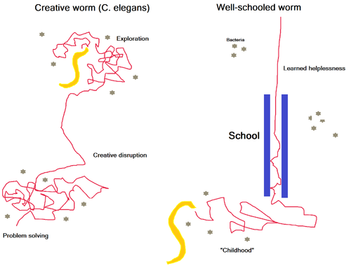 图示: 秀丽隐杆线虫的神经系统仅由 302 个神经元构成,但这已足以实现一套让人联想到人类好奇心、创造力[8]和问题解决能力[9]的探索算法。当线虫发现一片食物时,它会进行探索,但偶尔也会出人意料地朝一个随机方向冲刺,以寻找新的食物源(细菌)。类似的算法在其他动物中也能找到,但人类的学习内驱力[10]要复杂得多,它基于知识估值[11],且探索性的「出走」只发生在学习熵[12]远低于预期值时。人类的创造力基于知识,而线虫的创造力仅体现为方向的随机选择。对线虫而言,找到一片新细菌就是解决了问题;而对人类而言,解决问题可能意味着一个改造火星的新想法。最后,用于诱导原始动物产生习得性无助[3]的比喻性工具(图中标为「学校」),在其身上可能只表现为驱动力的习惯化。尽管如此,这条小线虫或许能更有力地说明,智能导弹的比喻[4]远比我们想象的更具普适性,甚至可能适用于原始的神经系统。 关于学习内驱力普适性的更多信息,请参阅:好奇心的心理学和神经科学。