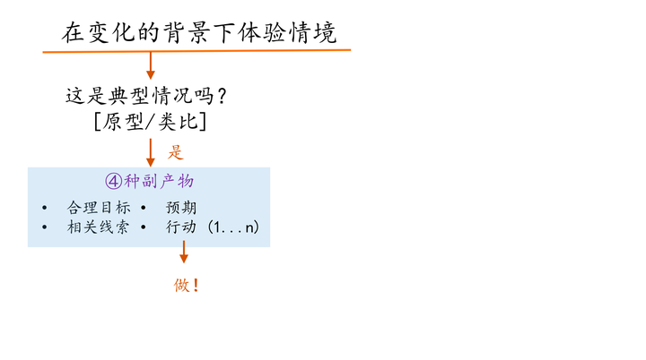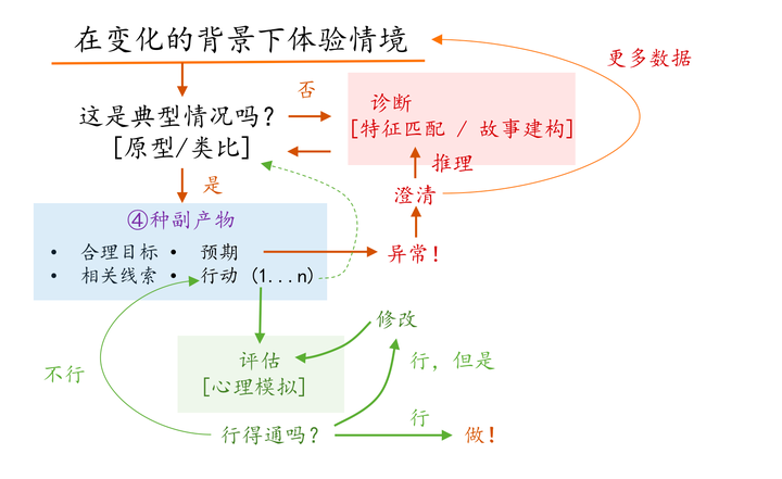 - 一组合理的目标——专家能够分辨当下应优先处理的事项和可以稍后解决的问题。例如,在遭受攻击时,一位海军陆战队小队长必须在保障队员安全、寻找更好的掩体和完成任务目标之间做出优先级排序。他识别出的情境原型告诉他在特定情境下应该优先考虑什么,从而释放认知资源用于其他形式的思考。同样,一位程序员收到一系列业务需求后,能够根据识别出的情境原型,立即在脑海中生成一个优先级分明的目标清单。
