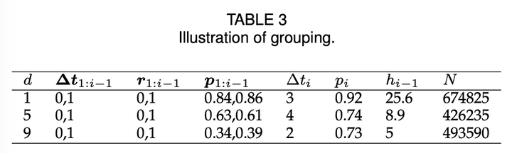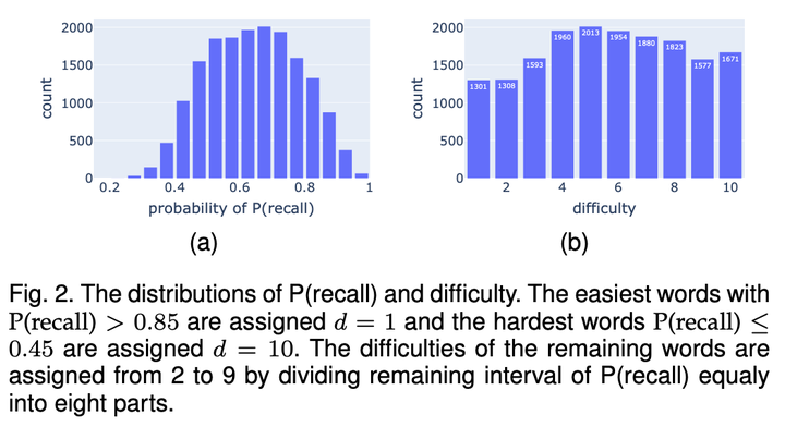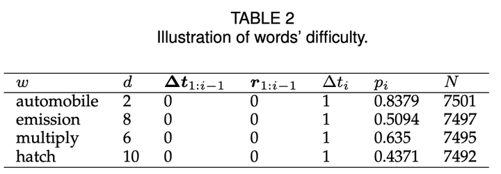 这种处理方法忽略了学习者本身的特质。但即使如此,由于时序数据的空间维度随着序列长度指数爆炸,我们收集到的数据在进行分组后,每组的样本量较少,估计误差较大。为了缓解数据稀疏性,降低误差的方差,我们将单词划分为了 10 个难度,如图 2 和表 2 所示: