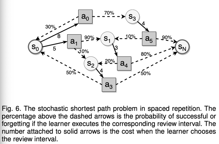 如图 6 所示,圆形表示记忆状态,正方形表示复习行为(即本次复习后的间隔),虚线箭头代表给定复习间隔后的记忆状态转移方向,实线箭头代表给定记忆状态下可选的复习间隔。间隔重复中的随机最短路径问题,就是从初始记忆状态出发,找到每个记忆状态下最优的复习间隔,最小化达到目标记忆状态所需的期望复习成本。