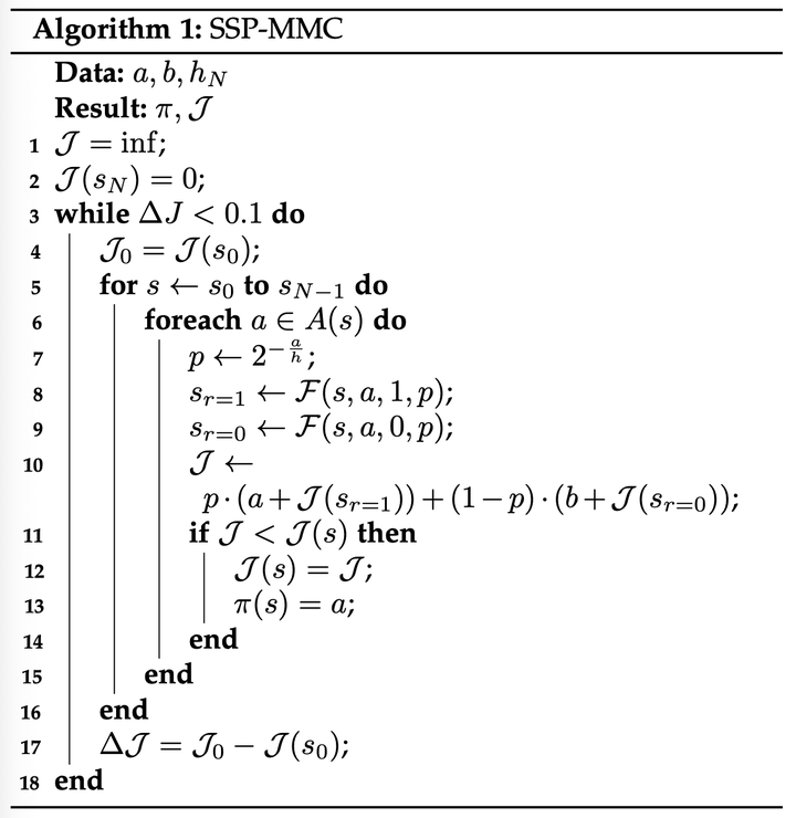 基于上式,我们设计了值迭代算法,如算法 1 所示,使用成本矩阵来记录最佳成本,策略矩阵来保存迭代期间每个状态的最佳动作。