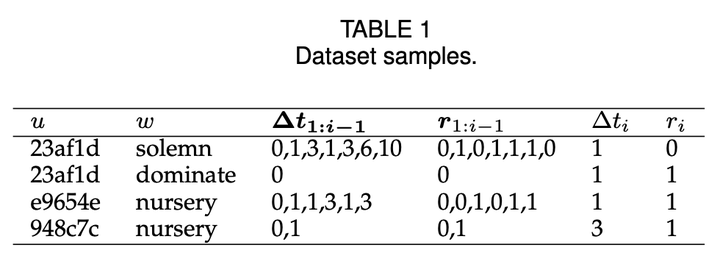为了得到时序数据,我们将学习者对同一单词的所有记忆行为按照发生时间排序,然后将 和
