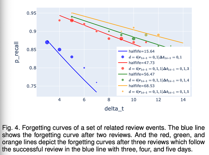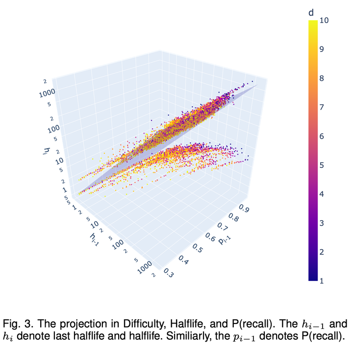 基于上述方程,给定初始难度和半衰期,我们就可以计算任何记忆行为序列对应的记忆状态。