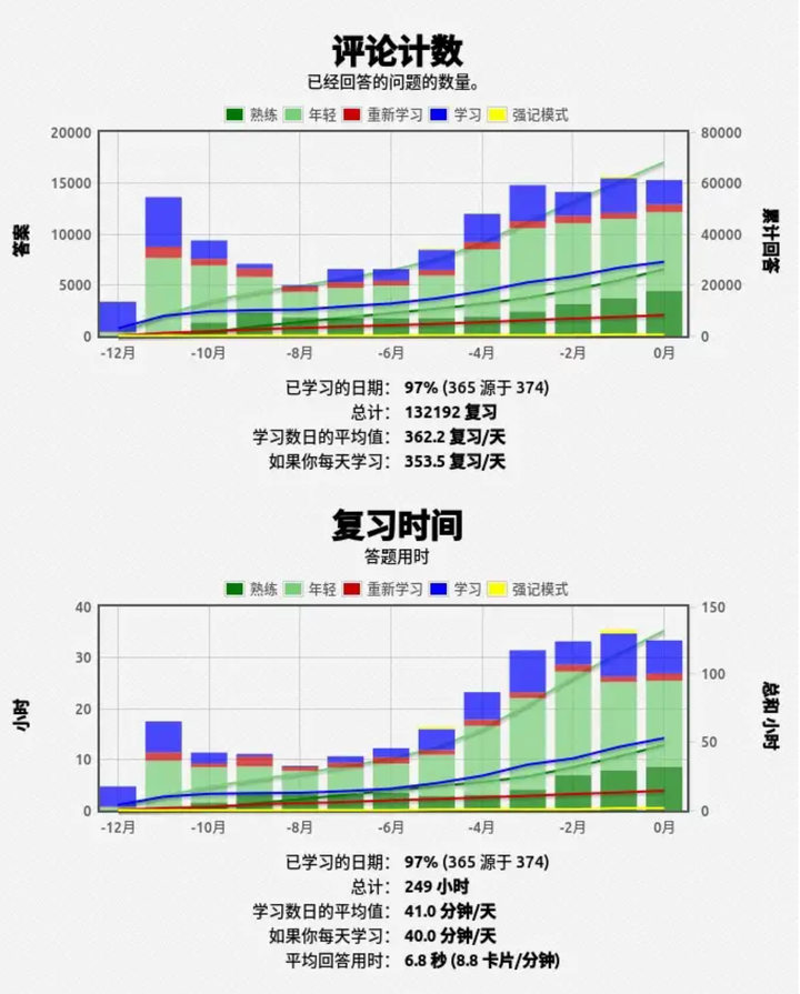 当时我差不多每天花 40 分钟到 1 个小时在间隔重复上,每天都要自测三四百个知识点: