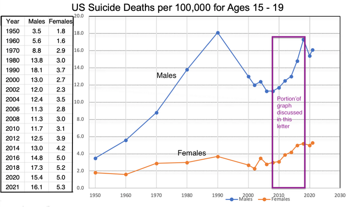 在这封信中,我将阐述并论证一个理论,以解释自杀率曲线最后阶段的变化,即从 2008 年到 2019 年(COVID 大流行前一年)间出现的急剧攀升。