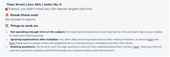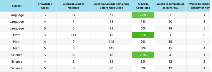 她已经「掌握」了三年级语言课程的 81/113,三年级数学的 141/157,以及三年级科学的 62/80。如果她保持每天每科学习 25 分钟、每周五天的进度,她将在三周内完成三年级的语言,一周内完成数学,四周内完成科学。而如果她决定加把劲,每天在某个科目上多花 35 分钟,她将在一周内完成三年级的所有内容。