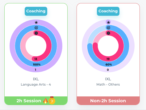 在这个例子中,这一天,我女儿在她的「2 小时学习时段」内,花了 13 分钟在语言艺术上。她答对了所有问题(鼠标悬停在蓝色圆圈上会显示 16/16),并完成了一次「掌握」(意味着她在掌握度测试中正确率超过 80%,因此这节课算作通过)。她还花了19分钟在数学上(但这并非在标准的 2 小时学习时段内,因此被标记为「非 2 小时时段」),正确率为 60%(10 题中答对 6 题),所以她当天没有获得数学的「掌握」认证。这两个科目旁边都有一个「辅导按钮」(并非每天每个科目都有)。