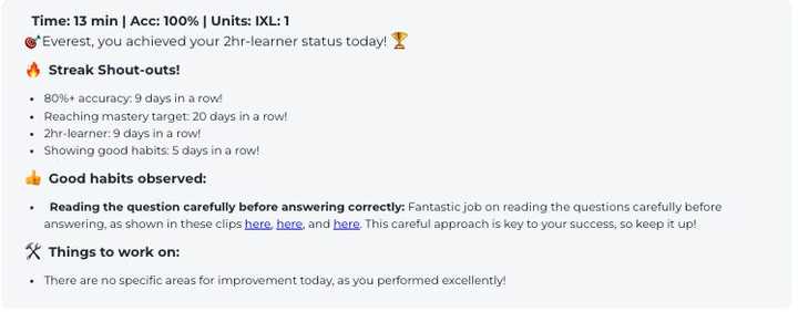 一天结束时,学生会收到一份当日的成就报告和总体反馈。(这可能就是所谓的「AI」发挥作用的地方。计算机会追踪学生的点击和眼球活动,不仅能知道学生点击了什么,还能判断他们是否专心、是否分心,或者在答错题后花了多少精力去阅读反馈。)