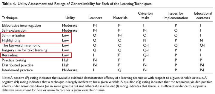 让我们再来看看这篇论文,用有效的学习技巧提高学生的学习能力[1]。从这个表格中,你可以看到,「标记重点」、「摘要」、「反复阅读」的效用均评定为「低」。