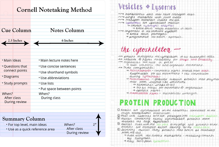 如果你执着于做笔记,请使用康奈尔笔记法,其笔记结构迫使你去思考和处理文本。这比通常的要点法要好(右)。