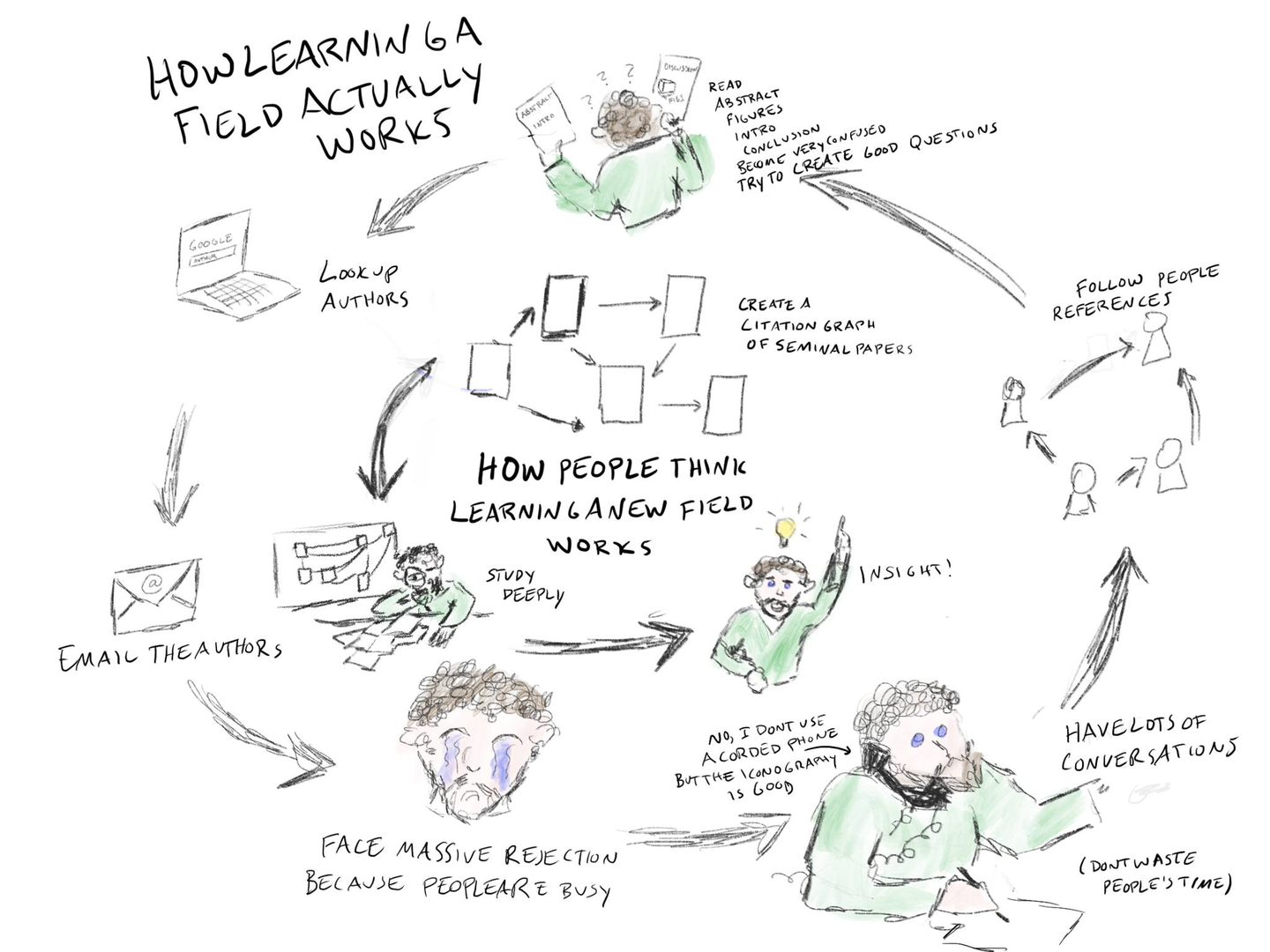 今年十月初,Ben Reinhardt 发布了下面这张图。它展示了「入门一个领域」的两种方式:一种被认为是「正道」(与人交流,即外圈),另一种则被描绘成一种误区(只顾埋头读核心论文)。「入门一个领域」可以有多种含义:它可以指学习该领域的具体内容,了解其学术圈生态(比如哪些是前沿方向、有哪些顶尖实验室、发展史如何),或是学会如何真正在这个领域开展研究。