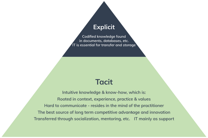 - 隐性知识无法通过常规方式(解释)来传授,而只能通过演示、学徒、模拟、视频或案例库等间接方式来传递。