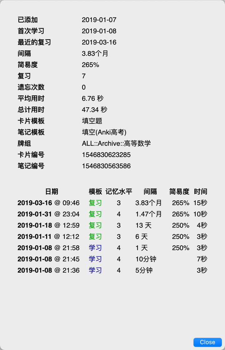 这张卡片对我来说有点复杂,所以我答错了一次,复习了10次,总共花在这张卡片上的复习时间是 1.88 分钟。