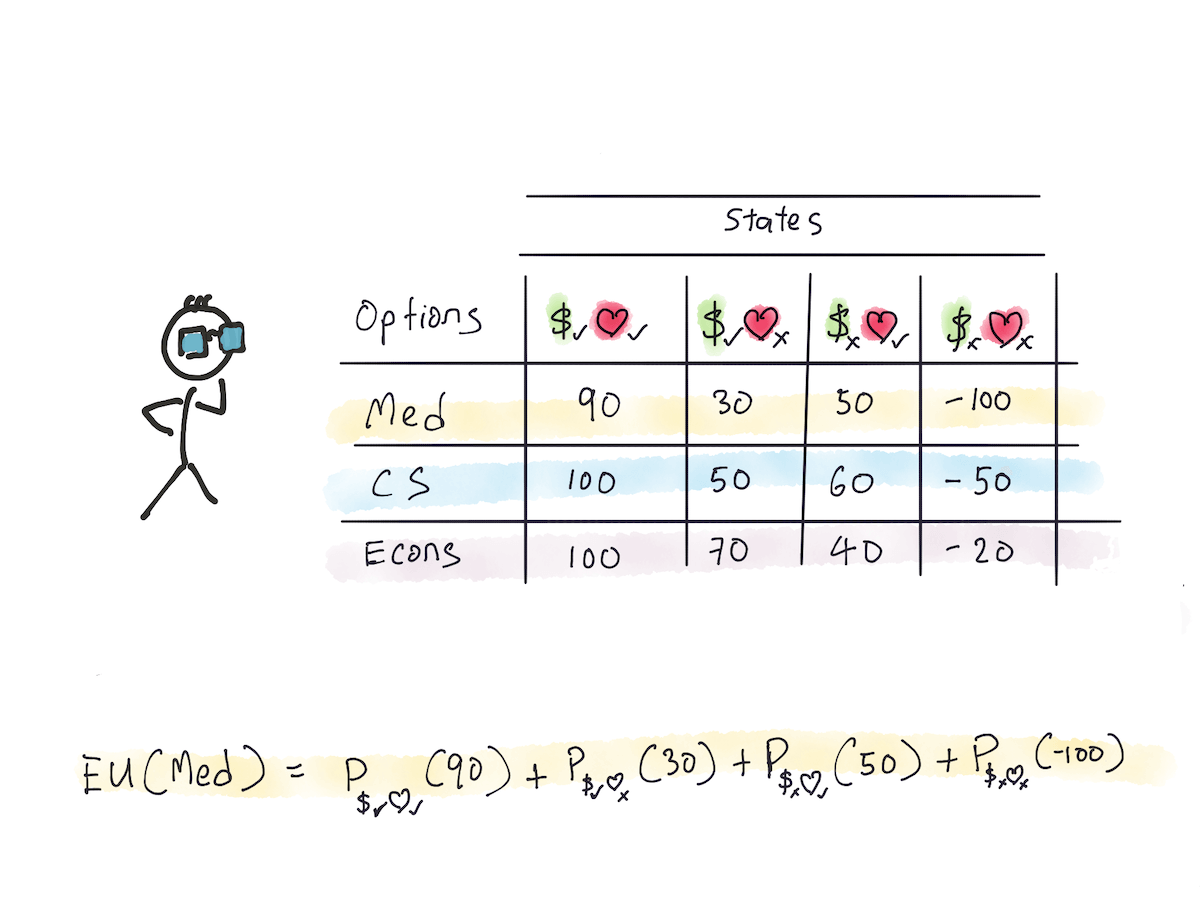例如,如果你的目标是「做自己热爱的工作,并赚很多钱」,而你面临着选择医学、计算机科学或经济学学位,期望效用理论认为,此时的最佳选择就是那个最能让你实现「做自己热爱的工作,并赚很多钱」这一目标的选项。期望效用理论的应用方式是:它为每种可能出现的世界状态赋予一个概率,然后将该概率与该状态下的期望效用相乘。某个选项的总期望效用,就是所有状态下概率与效用乘积的总和。