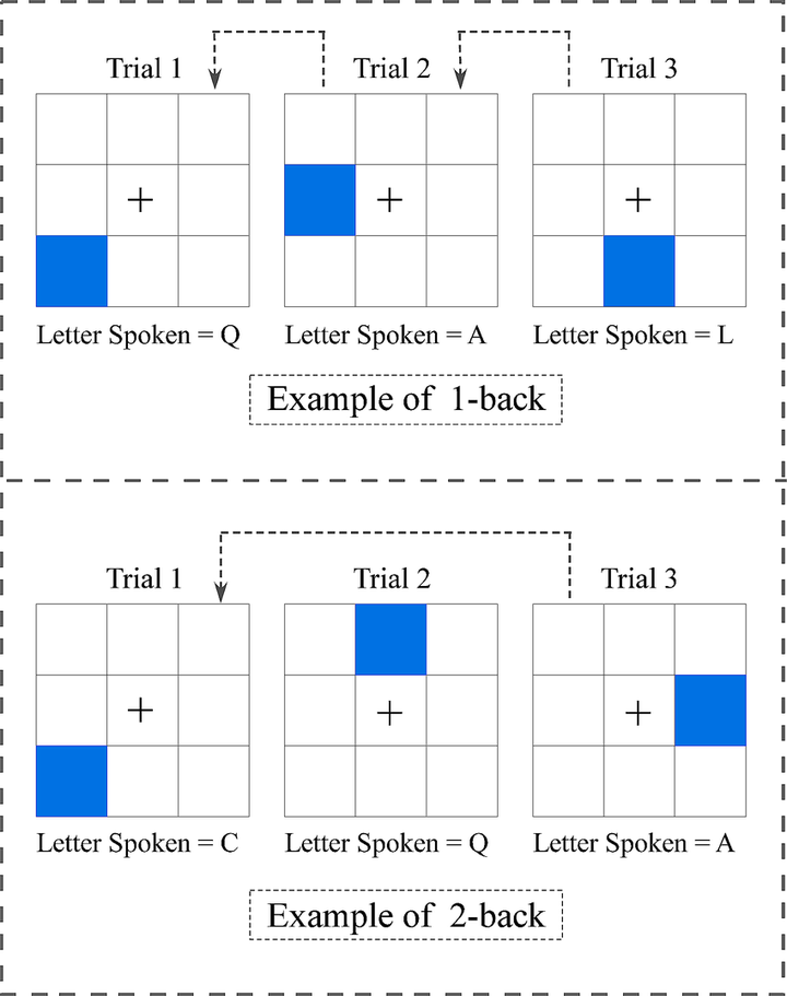 这给工作记忆带来了压力,因为你需要同时记住 4 件事:上一轮的位置和字母,以及当前轮的位置和字母(以便比较两者)。然后在下一轮,你需要立即忘掉已经无用的旧信息,并记住新的信息。你就在这个不断记忆、遗忘和比较的循环中。