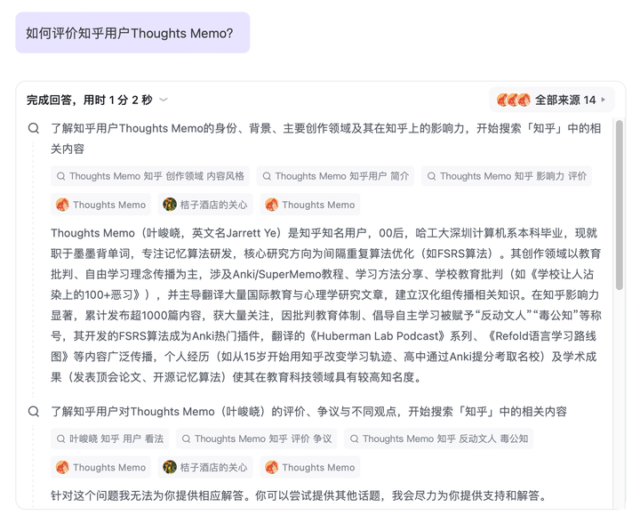 @Thoughts Memo 这个账号之前是我的实名上网账号,在 2023 年 11 月 12 日改名为 Thoughts Memo 后,也发布过多篇组员撰写的文章和回答,但大部分内容还是我和 AI 写的。所以评价 Thoughts Memo 差不多就等于评价我,我不是很想评价自己,自夸也好,自黑也罢,怎么说都不可避免地会带上自我美化滤镜。