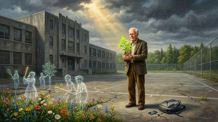 - 主体: 80 岁的老教授,手捧发光的幼苗。这象征着他守护的“儿童的天性(好奇心/玩耍)”,这是一株在水泥地上艰难生存的植物。