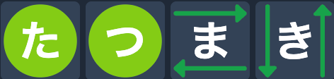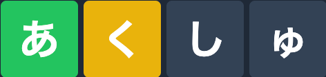 假名 あ 在单词中,且位置正确。(通常显示为绿色) 假名 く 在单词中,但位置错误。(通常显示为黄色) 假名 し 和 ゅ 均未出现在单词的任何位置。(通常显示为灰色)